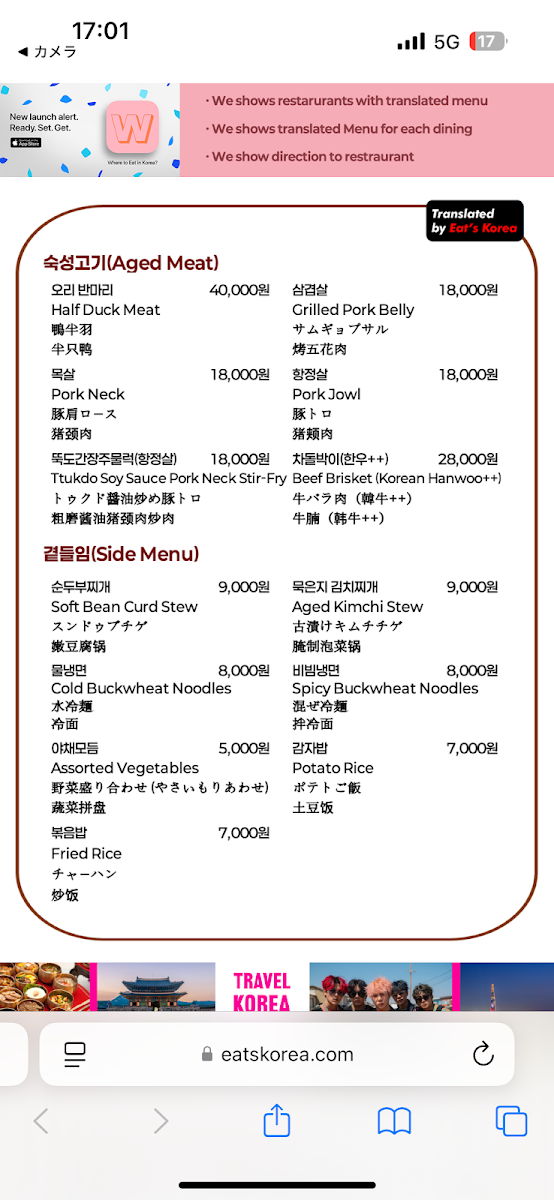 For a more specialized taste, 생오리로스 (Fresh Duck Roast) and 오리로스 부속단품 (Duck Roast with Side Items) allow for more varied experiences of the duck roast, adding a bit of customization to your meal. The 오리반마리 (Half Duck) offers a smaller portion, perfect for those who want to enjoy duck without committing to a full meal.