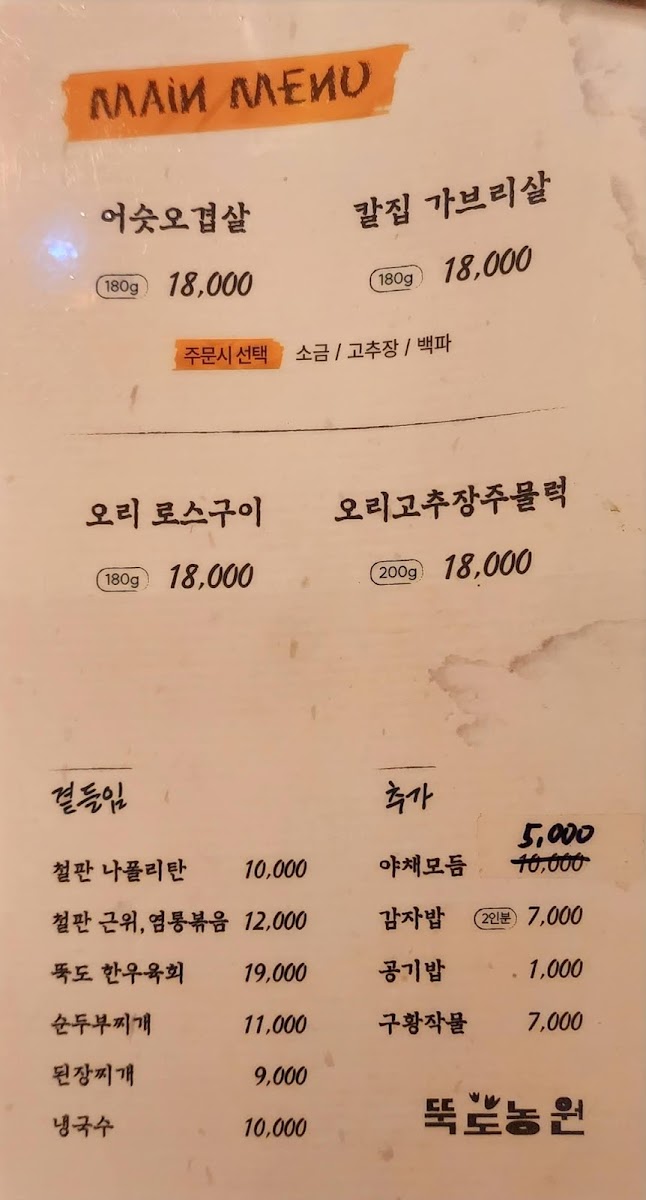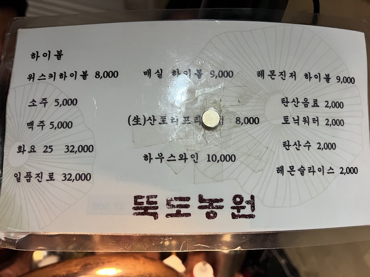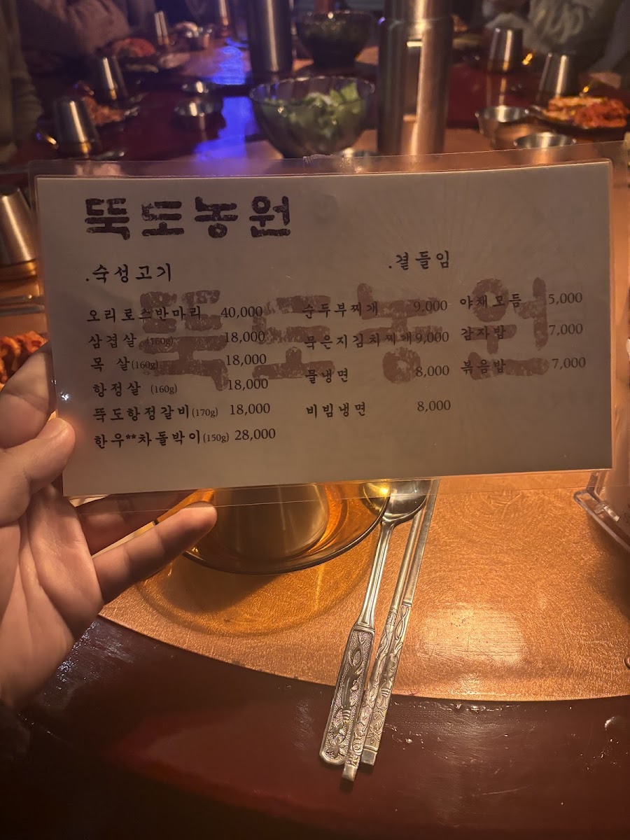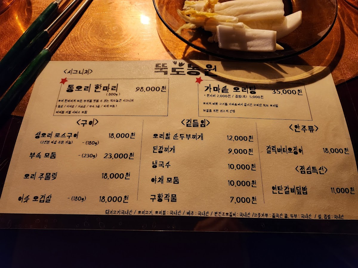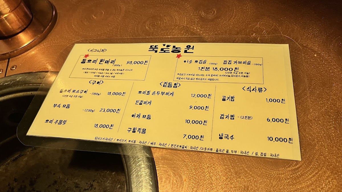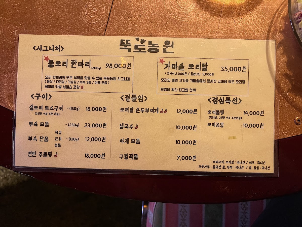 The menu at Ddukdo Nongwon offers a delightful variety of traditional Korean dishes, with a clear emphasis on duck. Among the most popular choices is the 오리로스 (Duck Roast), a signature dish known for its tender and flavorful duck served with crispy skin, a must-try for any meat lover. For those who prefer a more rustic dish, the 오리탕 (Duck Soup) is a hearty option, perfect for warming up during the colder months. The 오리불고기 (Duck Bulgogi), marinated in a sweet and savory sauce, provides a delicious balance of flavors.